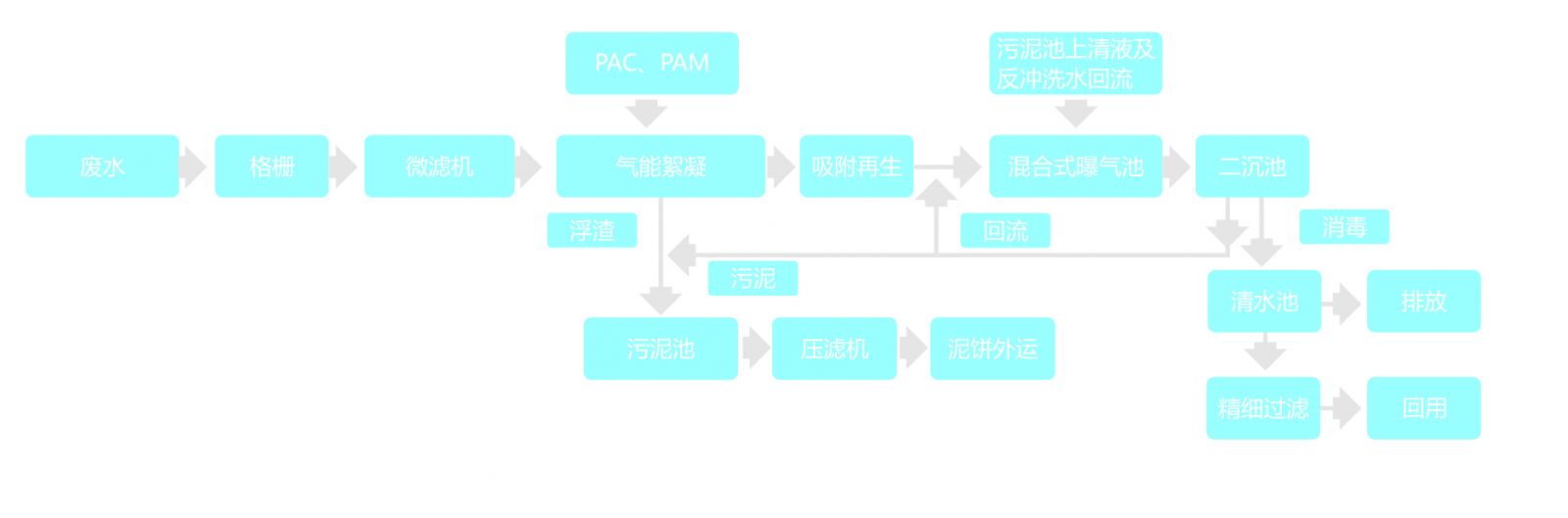 氣能絮凝系統(tǒng)的浮渣與二沉池的剩余污泥收集于污泥池,濃縮后通過(guò)壓濾機(jī)脫水后外運(yùn)。
