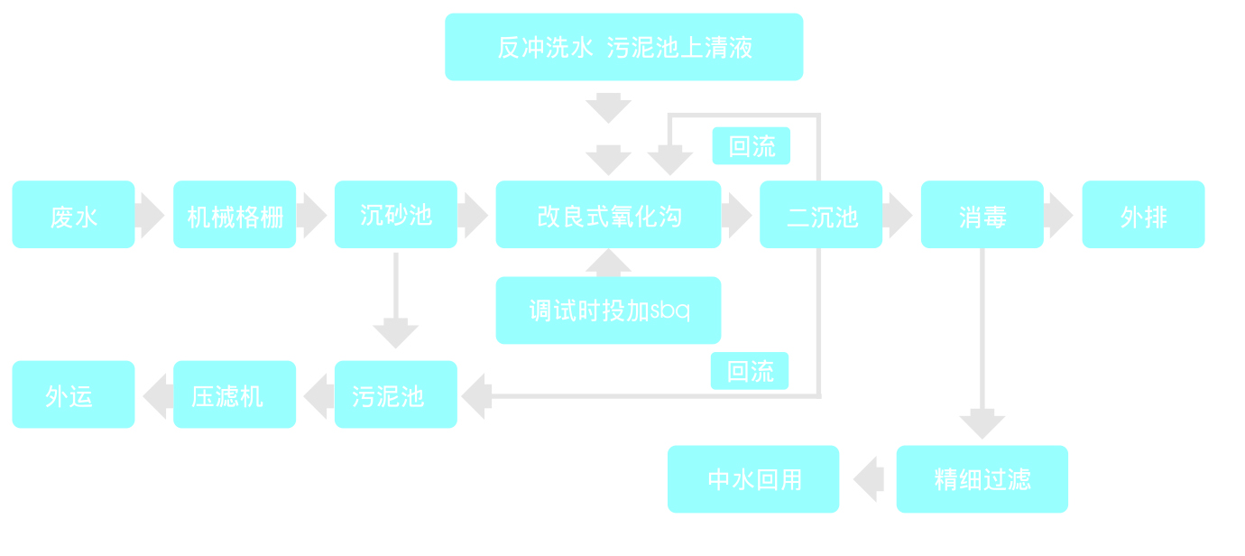 廢水經(jīng)機(jī)械格柵截留大塊飄浮物后進(jìn)入沉砂池,去除較大無機(jī)顆粒物。出水以兩點進(jìn)水的方式進(jìn)入改良式氧化溝,通過控制三點污泥回流的分配比來調(diào)整不同反應(yīng)區(qū)的C/N、C/P之比,并利用專有SBQ菌高效去除COD及脫氮除磷,出水進(jìn)入二沉池進(jìn)行泥水分離,上清液經(jīng)消毒后達(dá)標(biāo)外排,或經(jīng)精細(xì)過濾后作為中水回用。